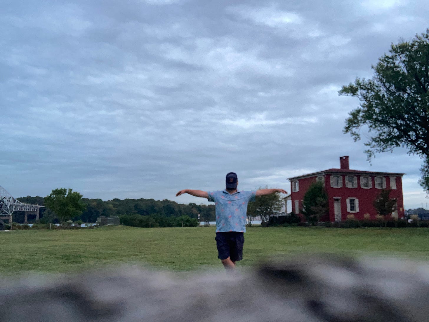 I walk around Havre de Grace and find a few different access points to the water including a historic lighthouse. In the center of the town, many businesses are closed but there’s an open pub and I stop in for a few drinks. I become aware through signage in town that I am close to an access point for the Mason Dixon trail, and I could leave the East Coast Greenway entirely and head due north on an entirely different route. I don’t think I’m going to do this, and the sun is setting, but I walk to the trailhead anyway to see if it will enchant me enough to motivate the reroute. I take a picture of myself near the trailhead with my Sox cap over my face.